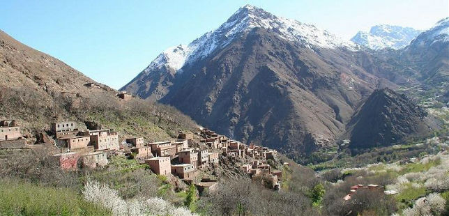 Departure by car from Marrakech around 9 in the morning for 2hour drive south up the Moulay Brahim Gorges, Asni weekly market every saturday then to Imlil (1740m), set in the upper level foothills of the Western High Atlas mountains, a main trailhead with streams and paths branching out in all directions. Here we shall leave our vehicle to take a welcome glass of mint tea in the village and meet your local guide prior to setting out for some 4km excursion. towards the south to the Berber village of Aroumd (Aremd) (1843m), passing the hamlets of ait souka, Targa, and Imoula, up and down the stark slopes, the jagged Western High Atlas peaks of the Toubkal Massif before us - Jbels Aguelzim (3547m), Aksouâl (3847m) and the Adrar Adj (3122m) watching us all the way. We shall stop at Aroumd to visit this rather singular village in the Assif Aït Mizane Valley, built seemingly house upon house on a large moraine spur, overlooking ancient irrigated terraced fields of barley, corn and vegetables and always surrounded by almond and walnut trees. We thence carry on for another Half an Hour to get to our lunch wish will be served among a berber familly in the village of Ait souka prior to setting off back down the other side of the valley back to Imlil and our return trip to Marrakech.